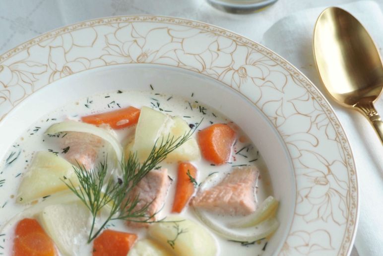 Salmon soup is a beloved Nordic classic, simple yet ah so good. Besides salmon, it uses only couple of other ingredients, but is filling enough for a hearty lunch or a light dinner, especially when paired with bread – preferably rye bread of course!