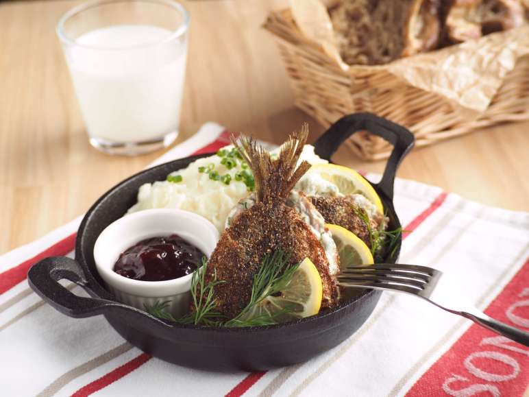 北欧はほとんどの家庭は共働きなので、毎日の料理は手早く作れるメニューが求めれています。身が小さめで柔らかいニシンは火通りが早く、スーパーで身開きの状態で販売されているので、さばく必要もなく、すぐ調理にかかることができます。そんなニシン2枚の間にディルなどのハーブを挟み、ライ麦粉でまぶし、たっぷりのバターで香ばしく焼きます。今回はクリームチーズフィリングを挟んだレシピをご紹介します。