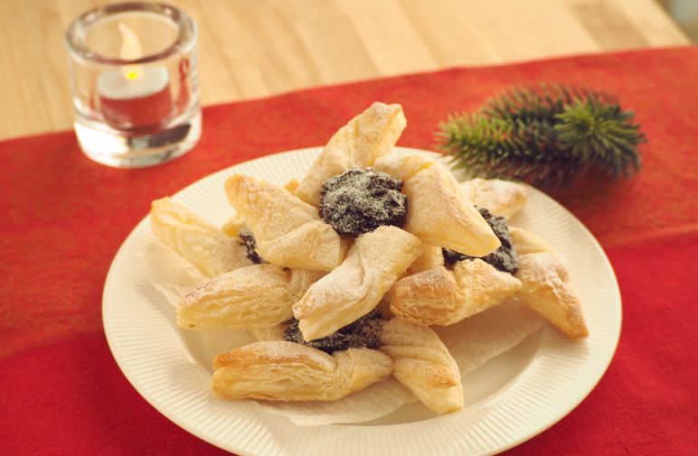 In Christmas it’s ok to eat during the night, and snacks are usually made available. Imagine having some glögg, the Nordic mulled wine, with gingerbread cookies and christmas pastries – it is as good as it sounds. The traditional christmas pastries are filled with prune jam, and folded to look like stars. They are easy to make with ready-made puff pastry dough, and the jam can be made with a microwave, so no pots and pans to wash!
