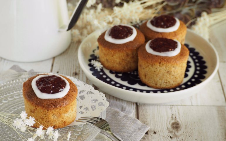 2)マフィン型の1/3までに①を入れ、ラズベリージャム小さじ1/2程度を各型に入れ、①の残りを乗せ、オーブンで20分焼き、粗熱をとる。