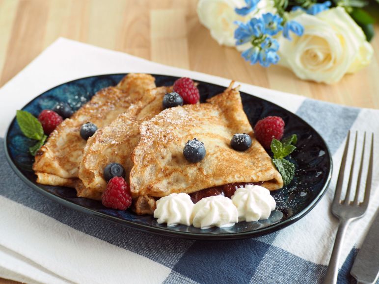 パリッとするためのポイントは生地に少し大麦粉又はライ麦粉を入れ、液体の一部は炭酸水を使うことです。フライパンもアツアツにして、たっぷりのバターで焼きます!いちごジャムと生クリームといただくのは定番ですが、他のベリーやアイスクリームにする場合もあります。