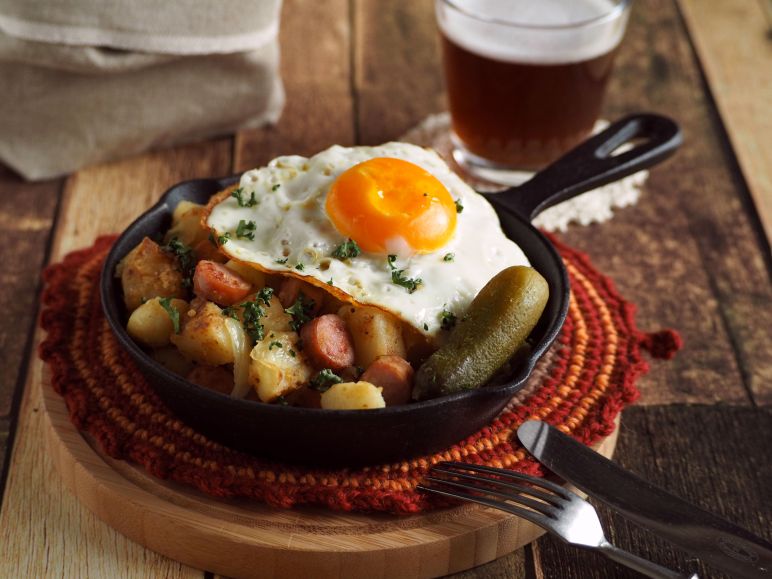 1)フライパンにバターとオリーブオイルを入れ、中火にかけ、じゃがいも、ウインナーと玉ねぎを加え、軽く焼き色が付くまでに炒め、ディジョンマスタード、パプリカと塩こしょうで味付けし、皿に盛り付ける。
