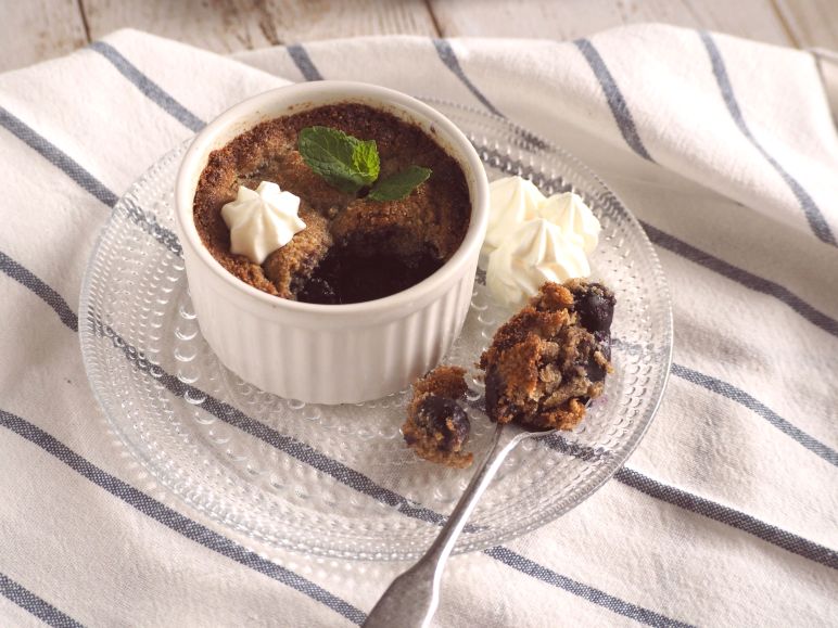 しかし、クッコなので、全部を混ぜて焼くのではなく、薄〜い皮の中にブルーベリーが入っています。そうなるとそのままで包むが難しく、容器に入れて焼くことが多いです。一つの大きなクッコにしてもよいですが、今回はココットを使って一人前のクッコにしました。