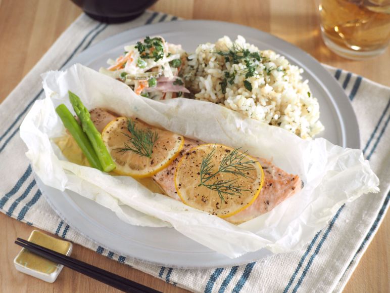 サーモンは骨が残っていれば取り除き、塩(分量外)を少々まぶし5分置いてからキッチンペーパーで余分な水分を切る。レモンは輪切りにする。アスパラは固い部分を切り落とし、半分に切る。オーブンは200℃に予熱する。
