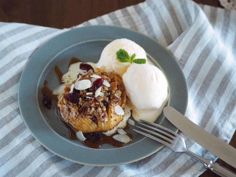 今回は数年前に流行った「ハッセルバックのじゃがいも」を真似し、ハッセルバックアップルにしてみました。オーツやナッツがたっぷり入っているフィリングを切り込みの中に浸透させれば味もブレがなく、スプーンで簡単に食べられます。
