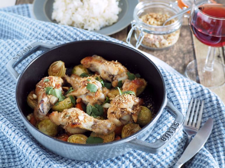 2)オーブン皿に人参と芽キャベツを入れ、上に手羽元をマリネ液ごとに乗せ、220°Cのオーブンで30分焼く。