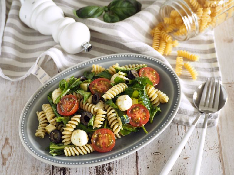 3) Put pesto genovese in a bowl, add lemon juice and mix well. Add ①, mozzarella, tomatoes, olives, zucchini and rucola. Mix together and put on plates. Serve as light meal or as side dish.