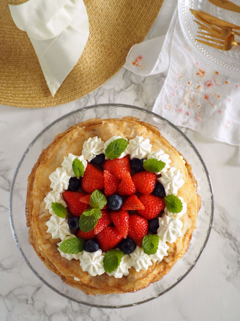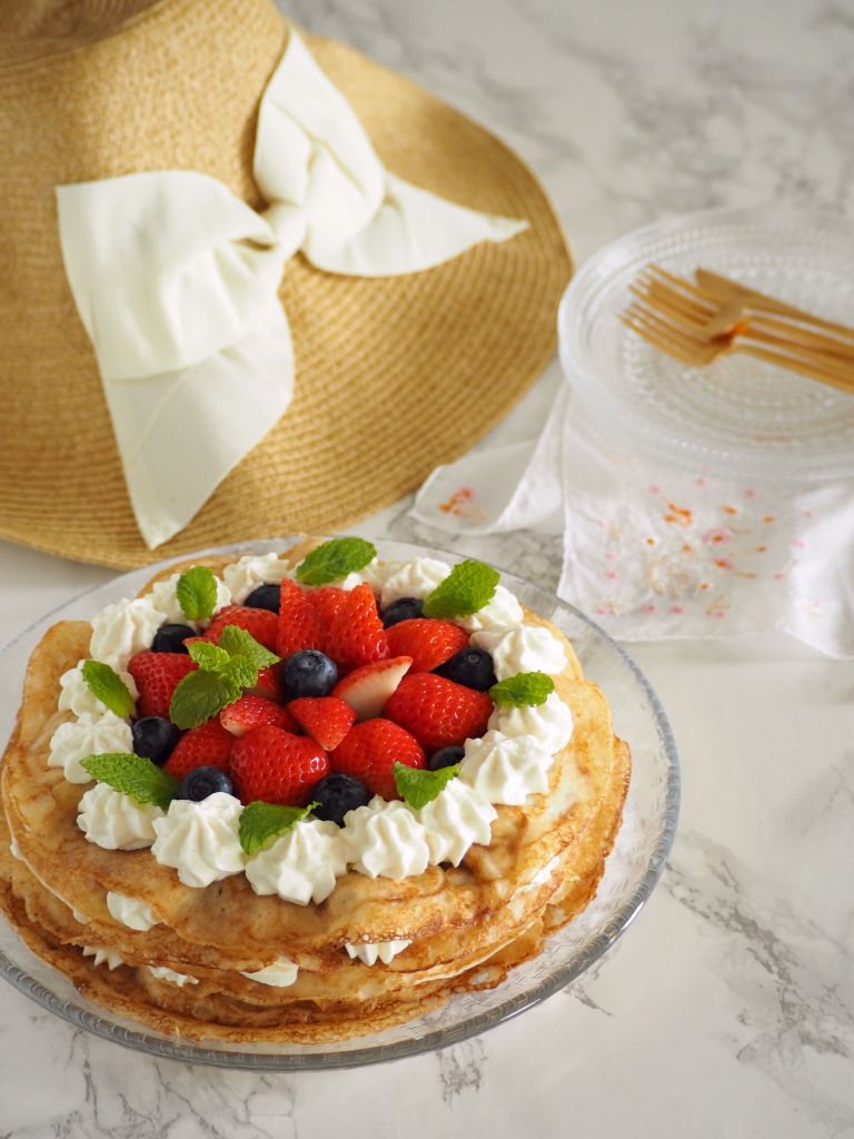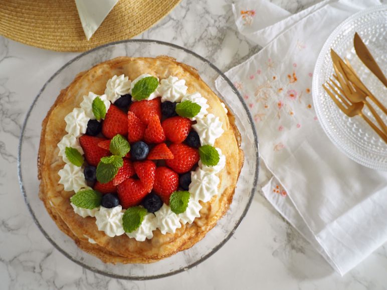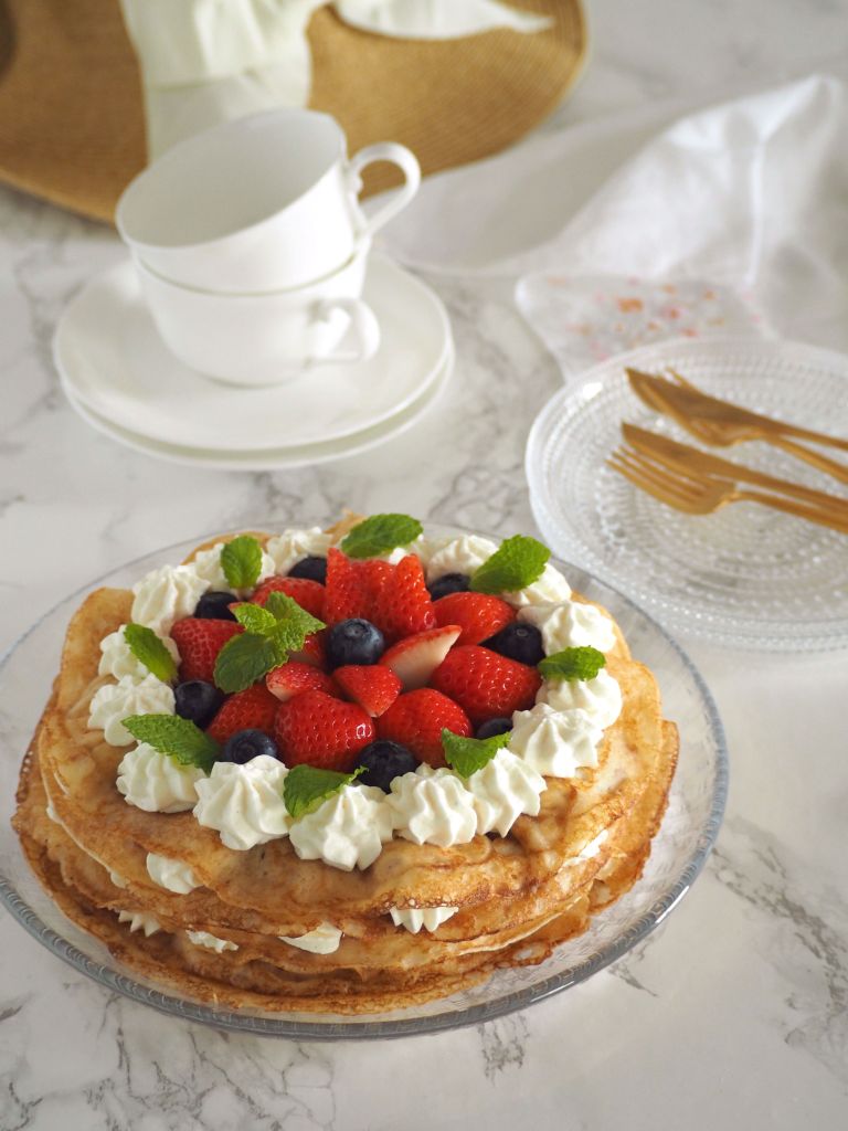 たっぷりのバターでクレープを焼き、その間にベリーやジャム、クリームを挟み、見た目はケーキっぽくなるように層を重ねていきます。今回はマスカルポーネを入れたクリームを使い、フィンランドのこの季節に欠かせないいちごとブルーベリーを使いましたが、好みのベリーやフルーツ入れてももちろんOKです。