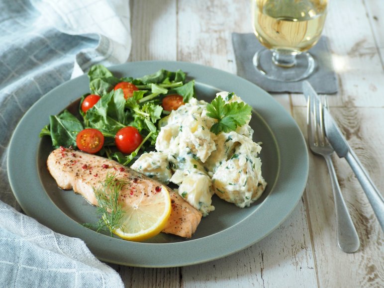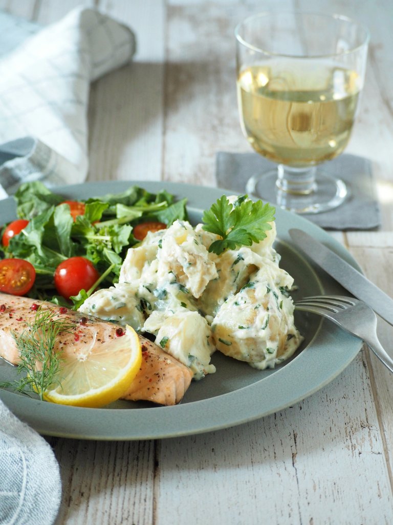 The point is to mix some chèvre cheese to the dressing to give the salad a creamy texture and tangy, salty taste. Potatoes are the main star though with only some fresh parsley added for taste & colour. Eat for dinner or serve together with some good wine – you can’t go wrong either way!