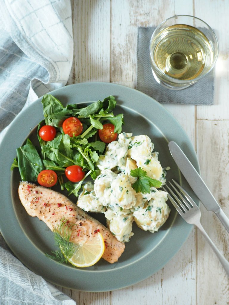 In Finland new potatoes only arrive around midsummer, so being able to savour those in February feels a bit odd, but I appreciate the early timing. Thus I decided to make a Finnish staple, potato salad with new potatoes – in Finland you’d eat this at summer cottage, but it’s a great addition to dinner plate next to fish or meat at home too.