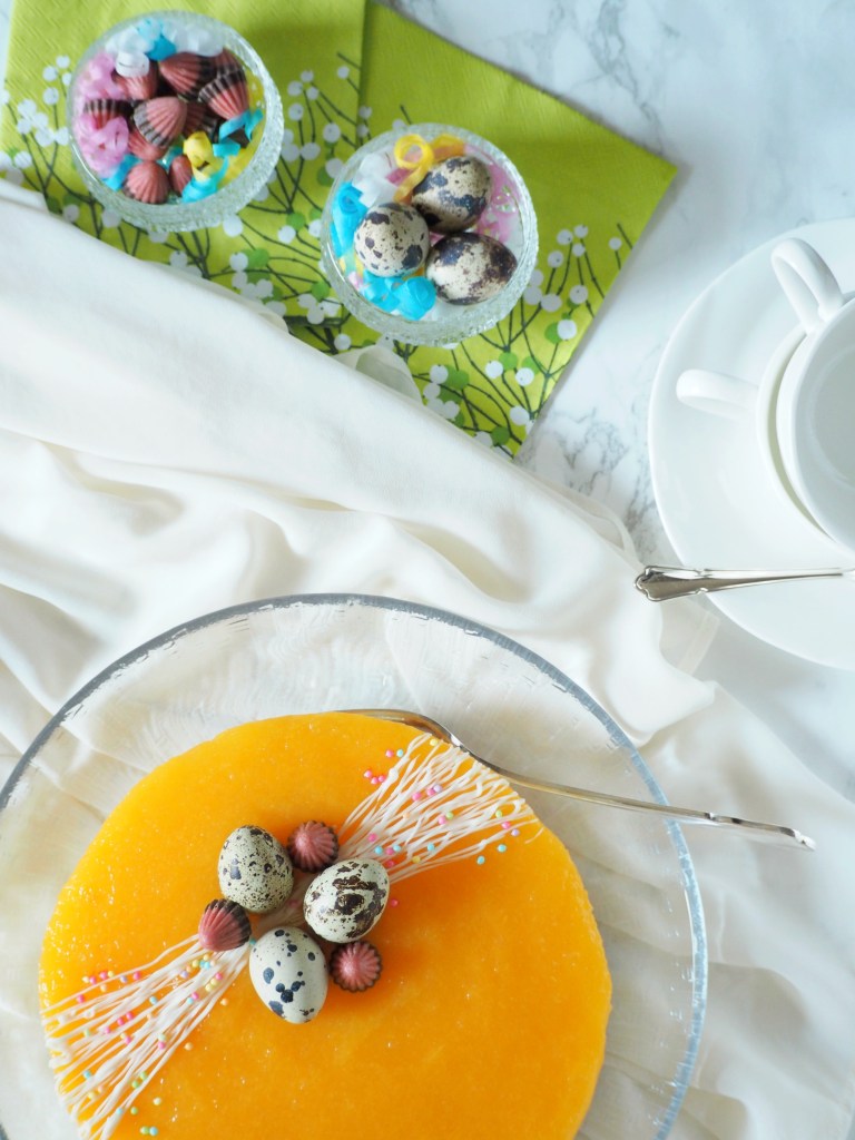 Golden peach rare cheese cake is not on everyone’s table on Easter, but as the vivid colours (and the great taste) tell it should be! It’s also easy to make as it requires no oven, and canned peaches are available in most countries despite the season.