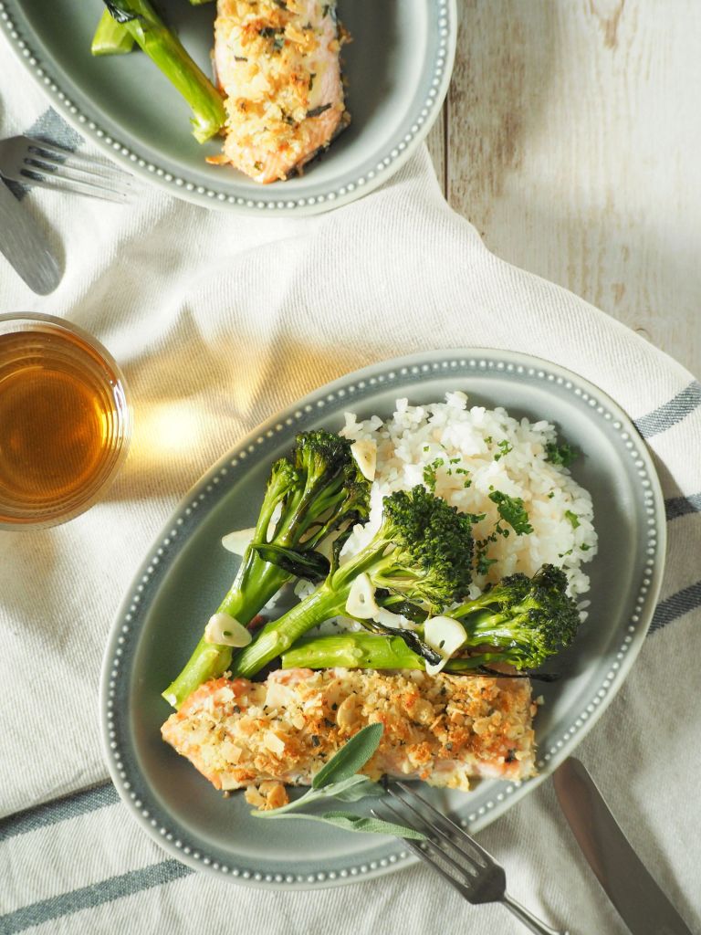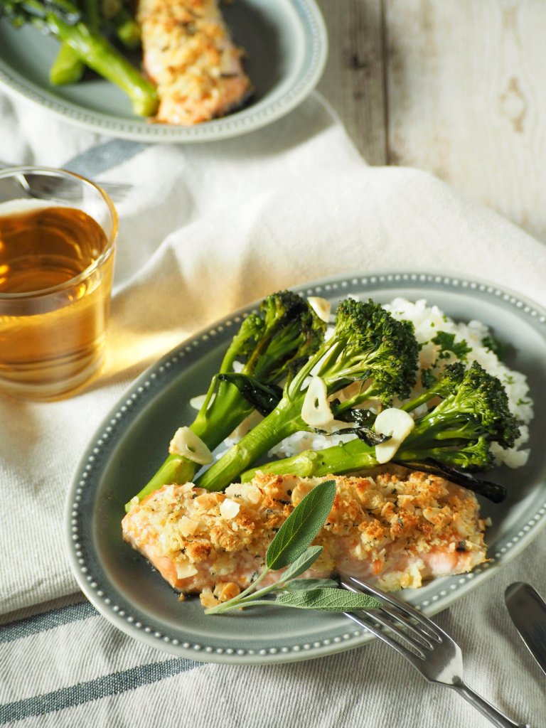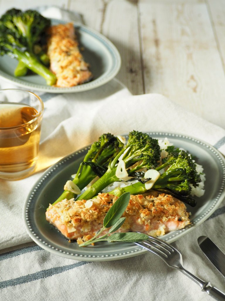 そんなサーモンのアーモンド焼きに殺菌作用もあるとされているにんにくで風味をつけて緑黄色野菜のブロッコリーをカリッと焼いて一緒にいただければ栄養のバランスがかなり担保された一皿になります!