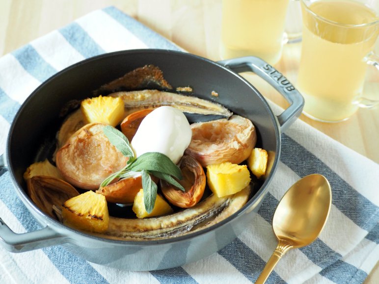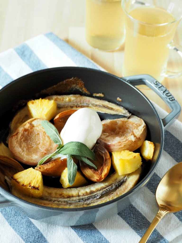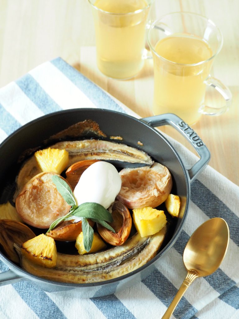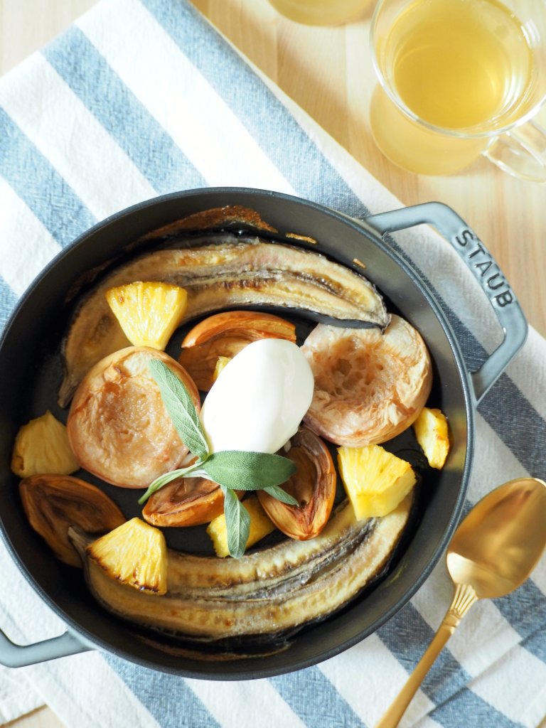 今回はバナナに日本でこの時期に手に入るフルーツを加えてストウブでオーブンのグリル機能を使って焼きましたが、グリルにアルミホイルを乗せて直火で焼くこともできますので、キャンプでも手軽にできるデザートです♪
