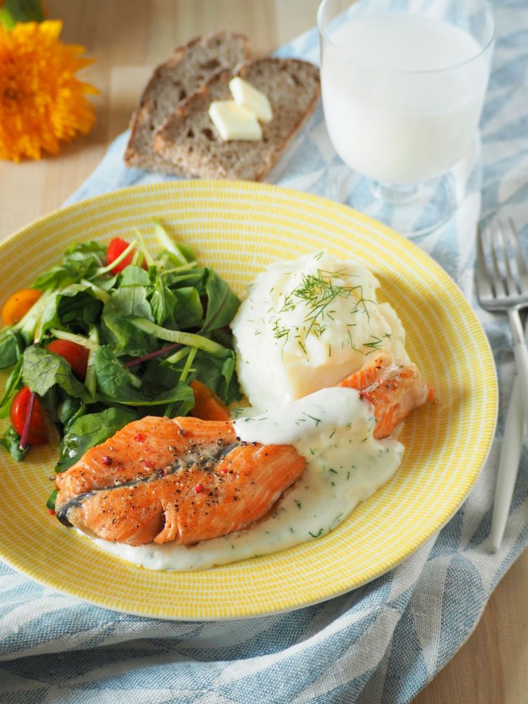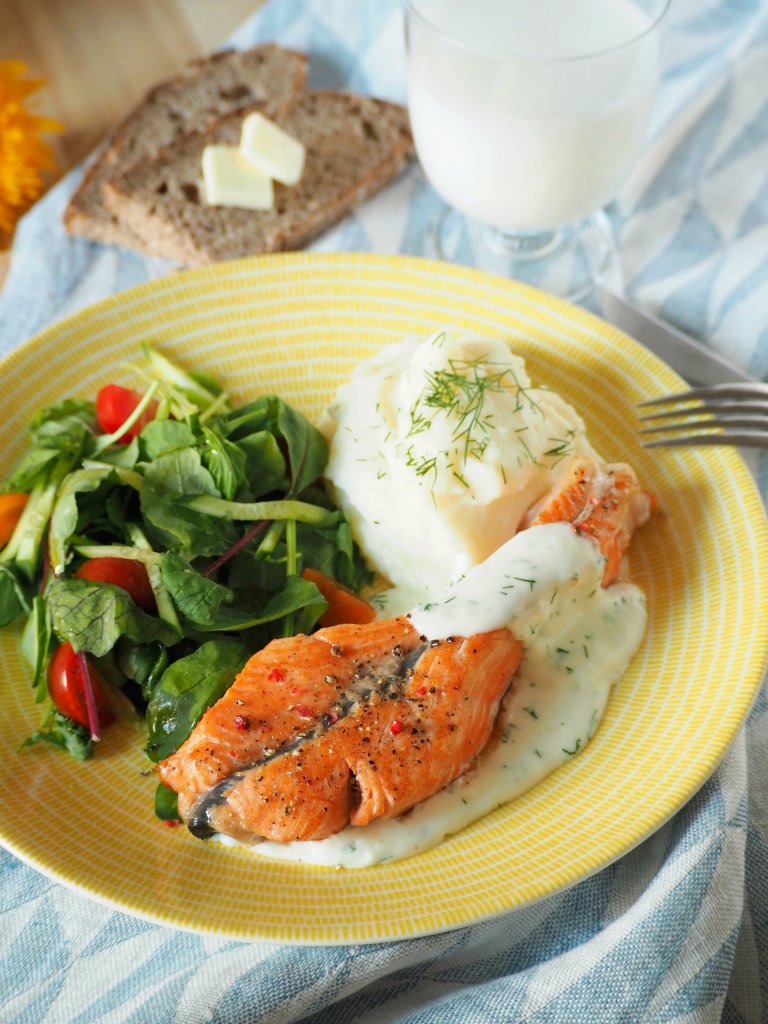 Fish is commonly served with white sauce in Finland, and this time I added in some dill to make it fit even more perfectly. This white sauce can be made in a microwave, so there is no worries about clumps in the sauce.
