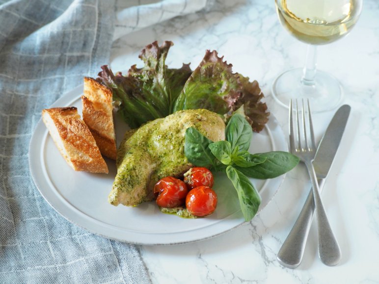 The trick is to use marinades and go for oven instead of a frying pan, which easily makes chicken to lose all its juiciness. This time I introduce a quick & easy oven dish using pesto genovese, or the green basil sauce from Northern Italy.