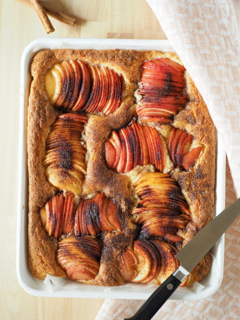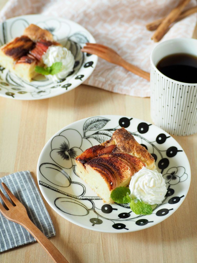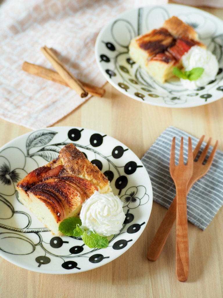 生地には北欧でよくお菓子に使われるカルダモンを入れて、上にたっぷりのシナモンをかけて風味豊かな仕上がりになります。←シナモン大好きなので、欲張りでかけ過ぎたら写真では焦げてるように見えます・・・(^^; あの黒いのシナモンですよ、焦げてはないです!汗 また、バター風味の柔らかい生地とシャキシャキしたりんごの食感も楽しめる一品です!