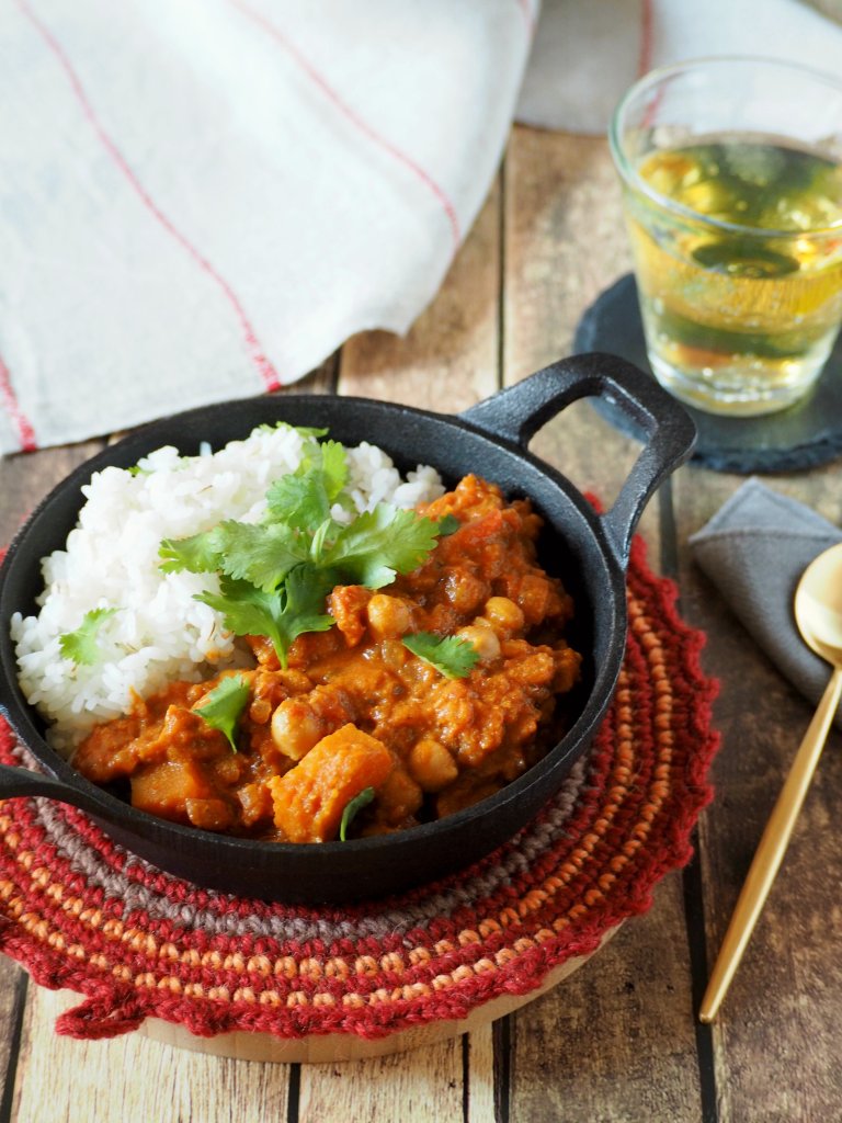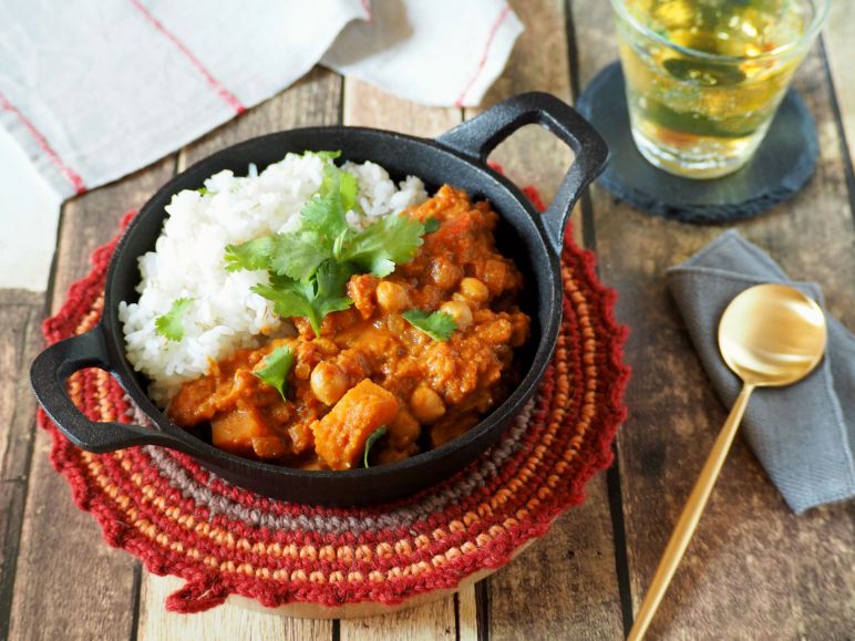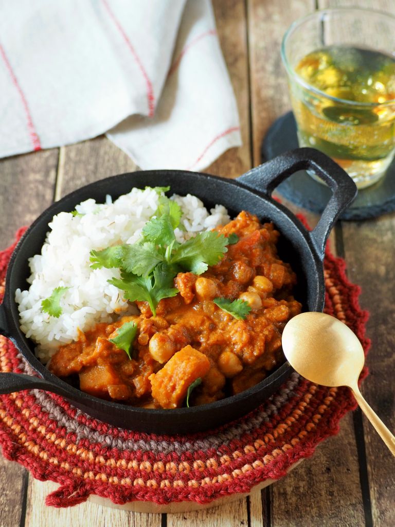 鶏肉の代わりに今が旬のかぼちゃと大好きなひよこ豆を使いました。味も食感も異なったこの2つの材料を合わせるバランスがとれた味わいになって、お肉は全然なくても満足感は抜群です。また、スパイスから作るのは難しそう、、と思う方もいるでしょうか、実はとても簡単でおうちでも本格的な味が出せます。