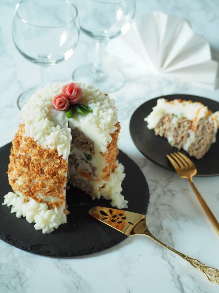 Meat loaf is the “sponge”, mashed potatoes serve as “cream” and bacon as “marzipan” for decorative roses… All looks so sweet but is actually savory! You could serve this even on April Fool’s and surely fool everyone!