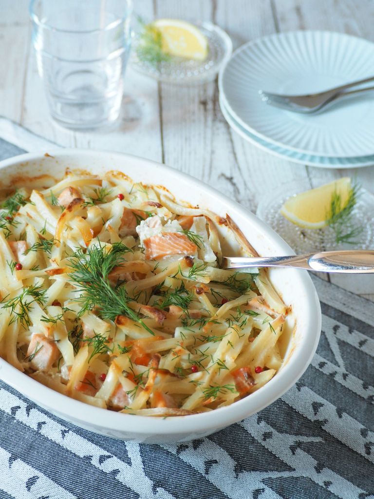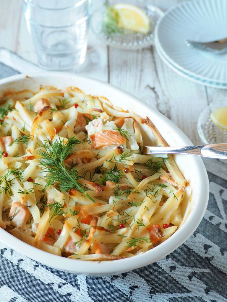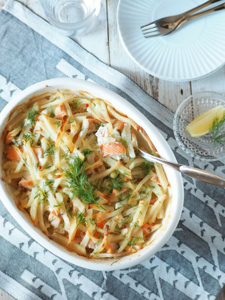 This time I introduce the Finnish school lunch classic, Salmon Frestelse a.k.a ‘lohikiusaus‘ in Finnish. Usually made with fresh salmon, I added some cold smoked salmon into the mix to give it a bi of a punch for adults, as the original can be pretty plain. Still this makes a heartwarming and healthy dinner to enjoy in cold winter days!