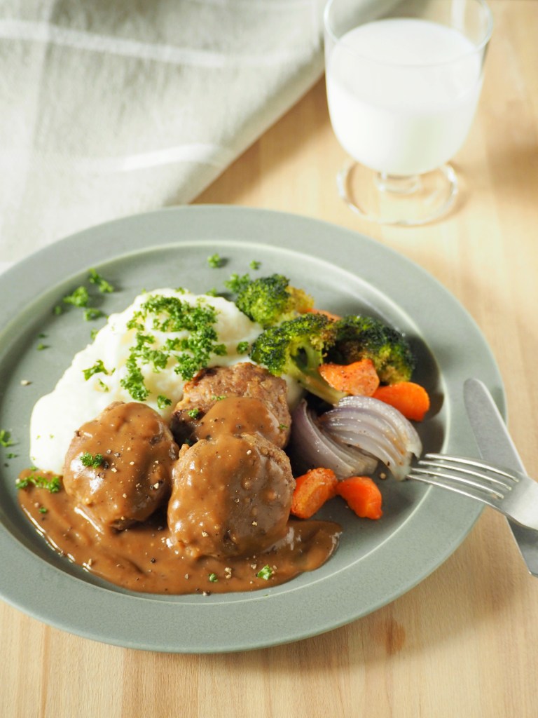 さて、今回は日本でもフィンランドでも家庭料理の大人ものハンバーグのバリエーションを紹介します。日本ではフライパンで焼くのは一般的ですが、フィンランドではオーブンで焼くのは主流です。オーブンで焼いたほうが油を使わなくて済むのでちょっぴり健康的に仕上がって、ハンバーグと一緒に野菜などをローストすることが出来て、時短にも繋がります。