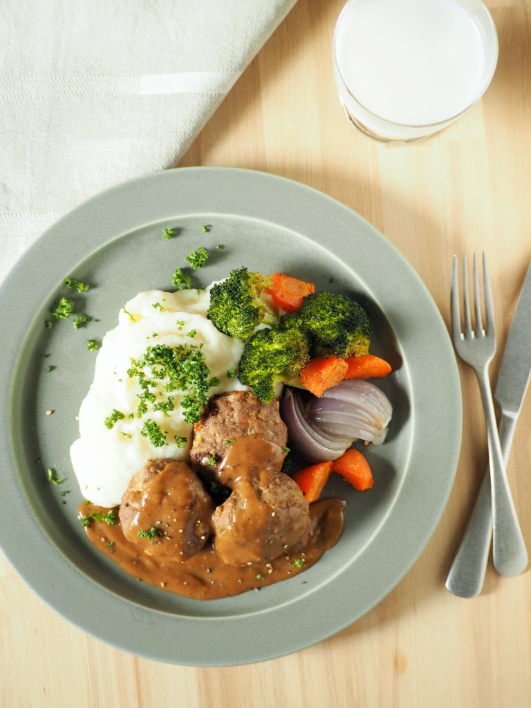 To keep the whole dish healthy, I switched cream sauce to simple brown sauce that is common in Finland – a simple sauce made from flour, butter and water. Sound plain? Well it surely is, but being healthy doesn’t have to mean tasteless, so I added some soy sauce for umami and a good dose of black pepper for the taste – and there we have a sauce that goes perfectly with the patties and the roast vegetables, if you decide to make those too…!