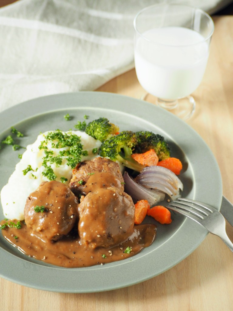 今回は「ヘルシー」というテーマなので、ソースもクリームソースではなく、シンプルなブラウンソースにしました。ただ、フィンランドのブラウンソースはデミグラスソースやグレイビーソースと違って、とても素朴で味がないと言われそうです・・・(^^; なので、今回はペッパーソースにアレンジしました。ピリッとしたブラックペッパーはハンバーグと相性もよくて、大人でも大満足する一皿になります。
