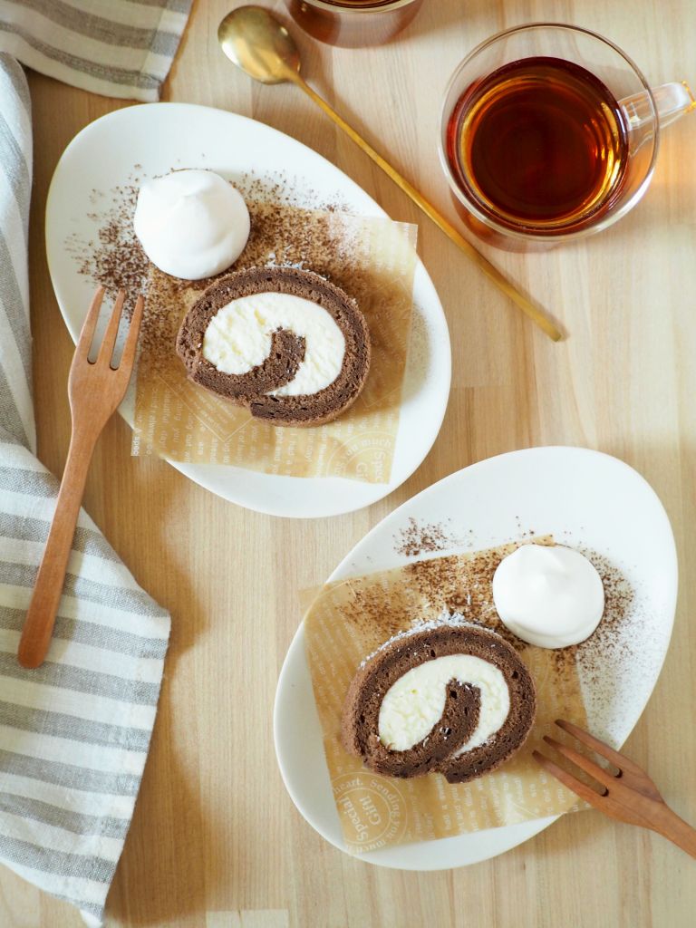 シンプルなココアロールにたっぷりのバニラ風味のクリームが入っていて、いくらでも食べられてしまう美味しさです。(実際に子供の時に一人でほぼ一本をペロッとしたことある記憶があります・・・^^;)ただ、実家にあったのはいつも市販のもので、実は手作りで作ったことがなかったので、ケーキの部分は少し日本風にアレンジし、フィリングのバタークリームもクリームチーズを入れて少しヘルシーに変更しました。