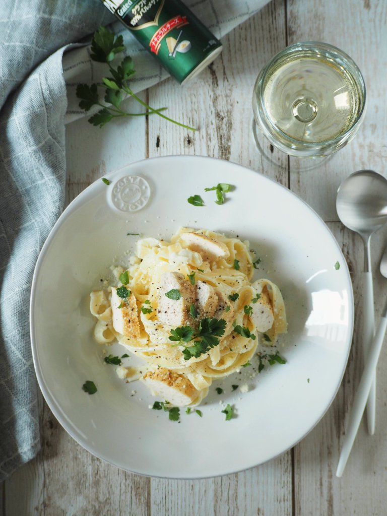 Well, it means more time at home and more time for cooking…! I remembered that one of my American friends once made a delicious chicken cream pasta, so I started to look for a recipe, and identified it as American-Italian classic, Pasta Alfredo. She added some red pepper to it to give it some colour and taste, but I decided to give mine a Japanese twist by adding some curry-flavour into the mix!