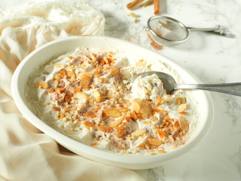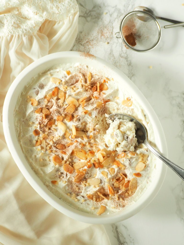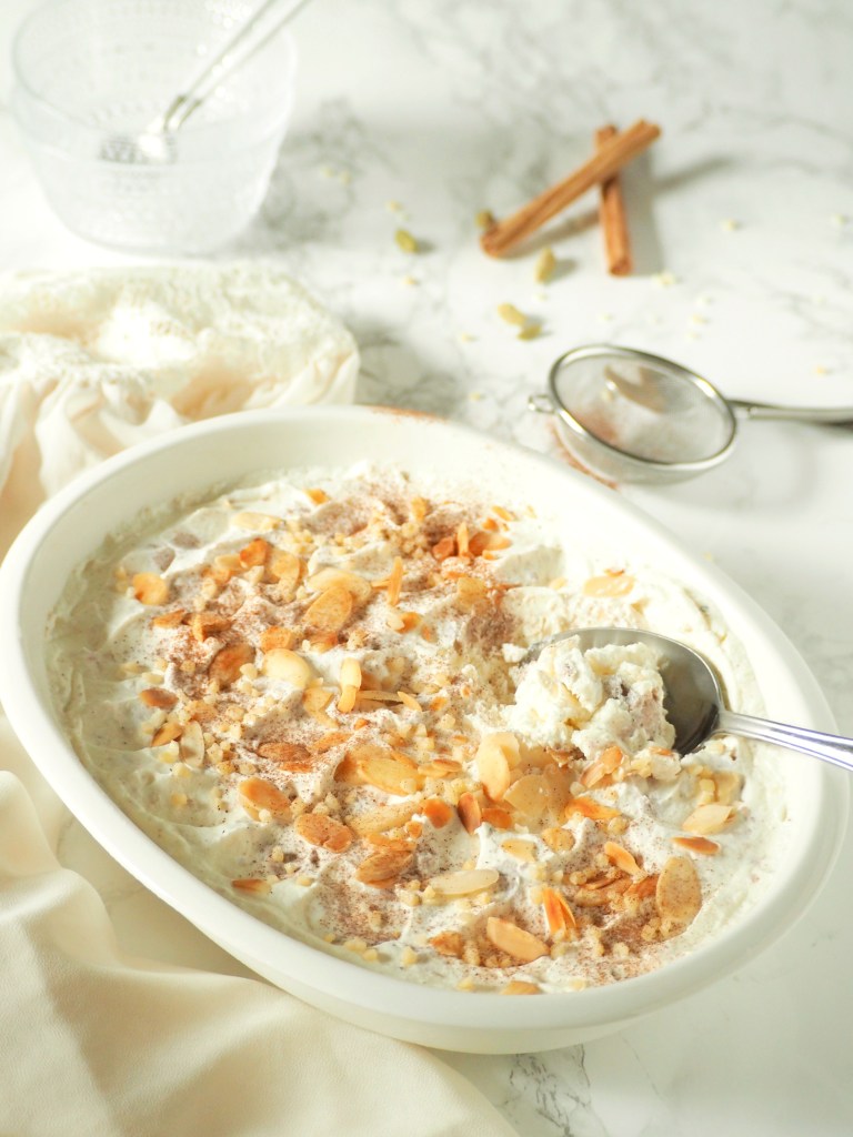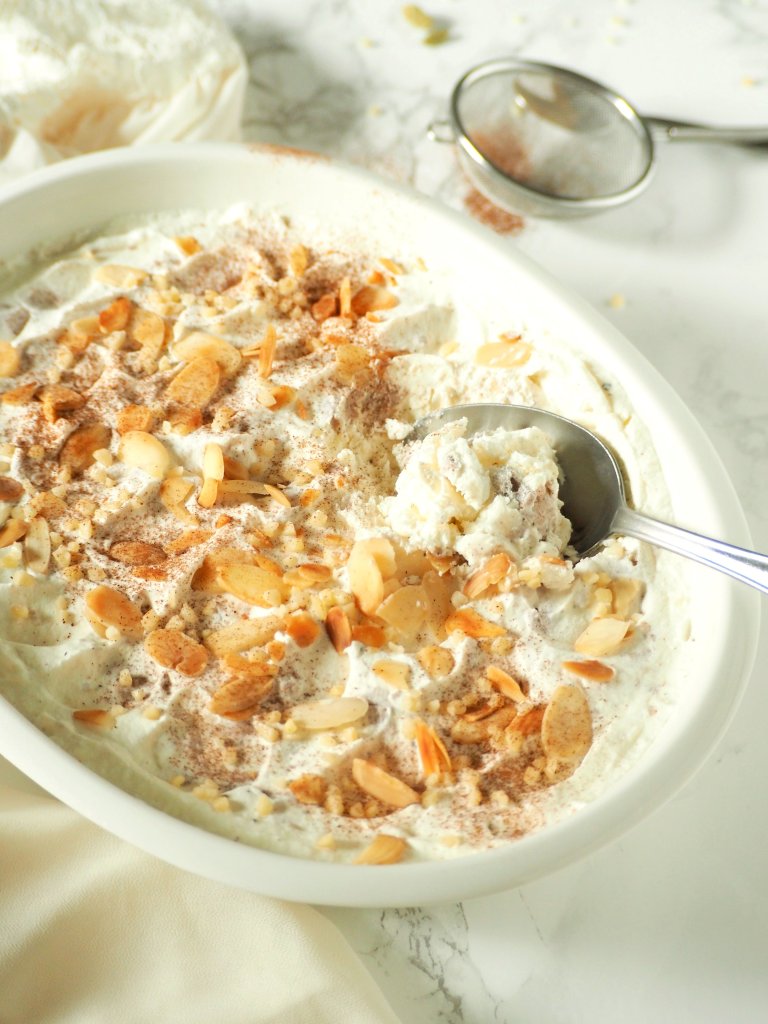 3) Whip cream and add sugar, corn syrup and cardamon. Mix gently with a rubber spatula until even and put half in a large casserole or plastic container. Add half of ② on top and mix roughly, then add rest of cream mix and ②. Again mix roughly, top with sliced almonds and cover with a cling film. Let freeze in a freezer for a night.
