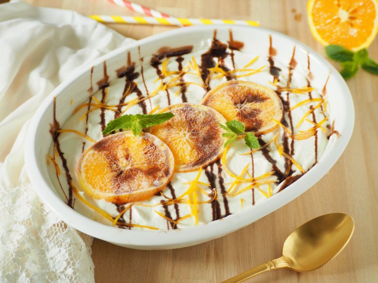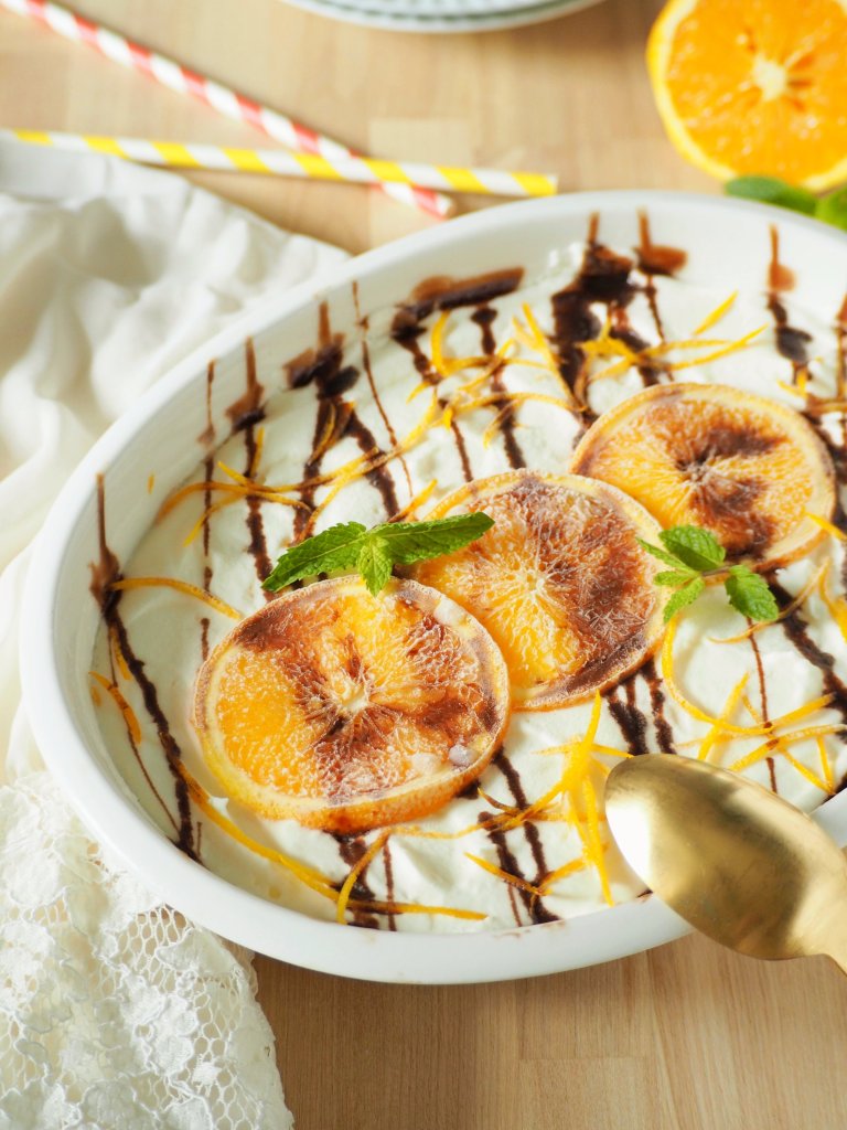 2)容器に②の半分を入れ、オレンジマーマレードの半分を乗せ、ヘラなどでざっくり混ざるように数回に切るように混ぜ、②の残り半分を乗せてマーマレードの残りも乗せ、またヘラで軽く切るように混ぜ、オレンジゼストを散らしてチョコレートソースをざっくりかけてラップをして冷凍庫で一晩寝かす。