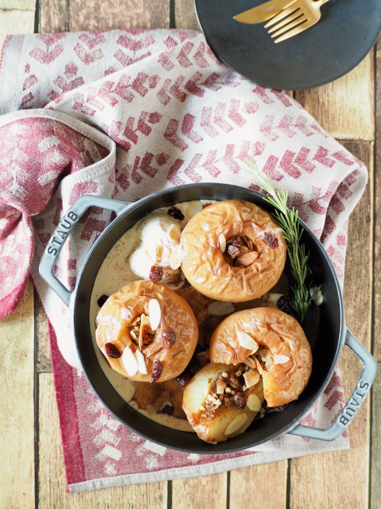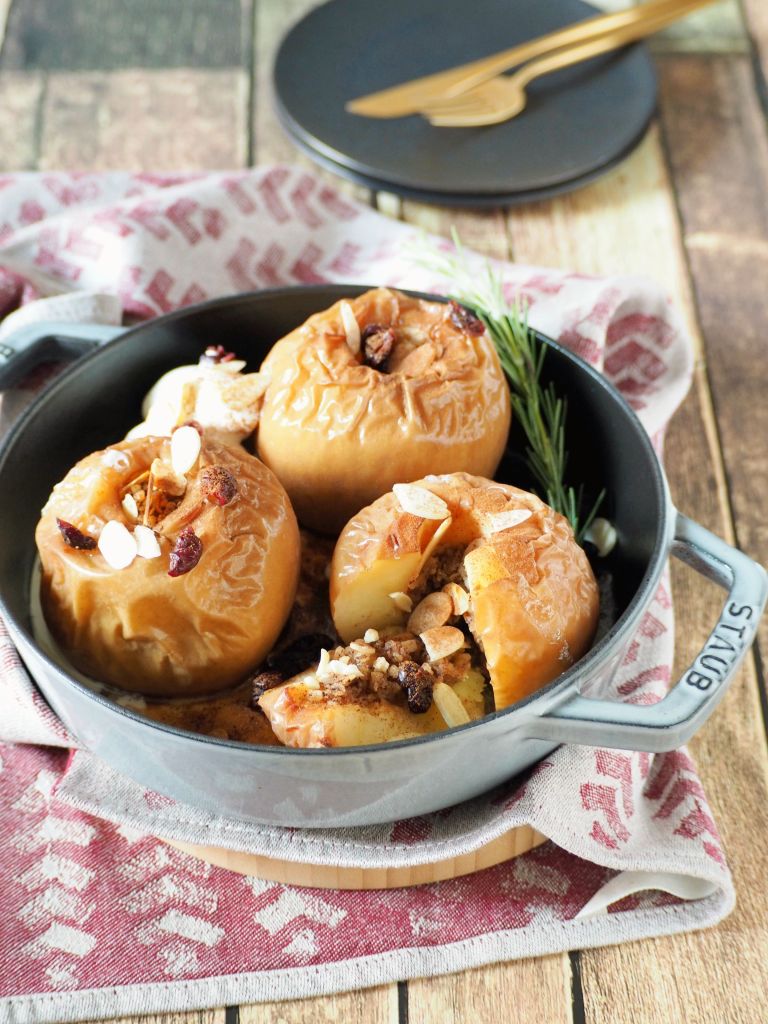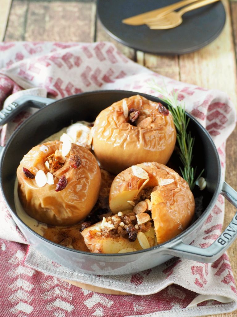りんごの中にはオーツやアーモンド、シナモンを入れたフィリングを詰めて、メープルシロップで香りよく仕上げてオーブンでとろとろになるまでに焼きます。アツアツのりんごにバニラアイスクリームを添えていただくと素朴な材料でも贅沢なごちそうになりますよ・・・!