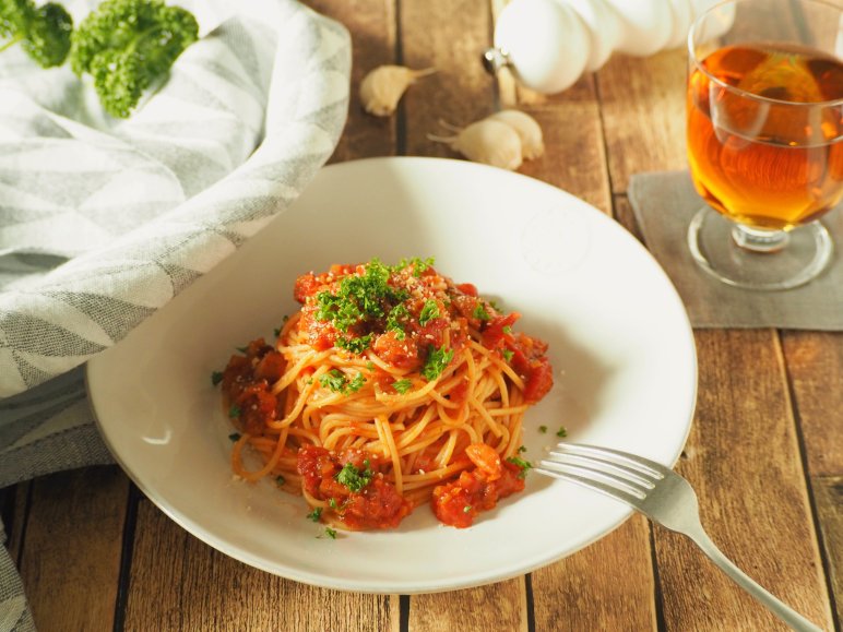 4) Add A) into ③, mix well and put a lid on. Let simmer over low heat around 15 minutes until becomes thicker. Add spaghetti, mix well and move into plates. Garnish with some fresh parsley and enjoy immediately.