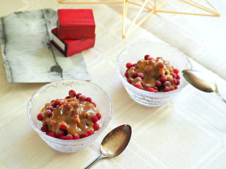 今回は摘みたてのひんやりのリンゴンベリーと温かい自家製のキャラメルソースをご紹介します。冷凍のリンゴンベリーが手に入ればそれを使用してもいいし、冷凍のクランベリーで代用することはできますので、試してみてはいかがでしょうか。