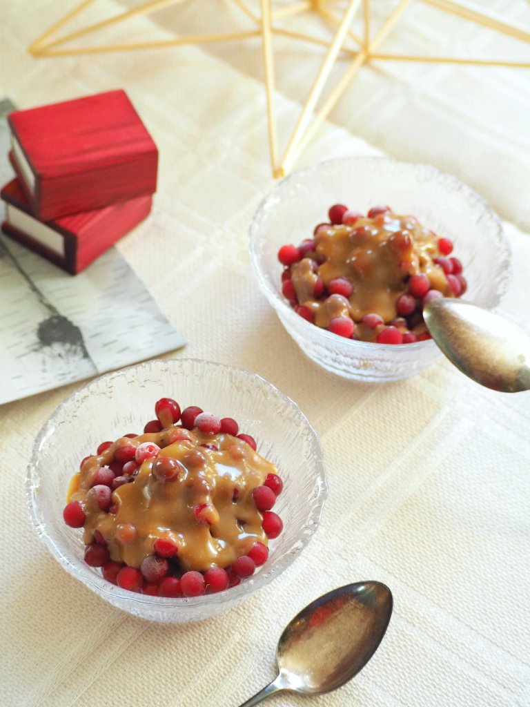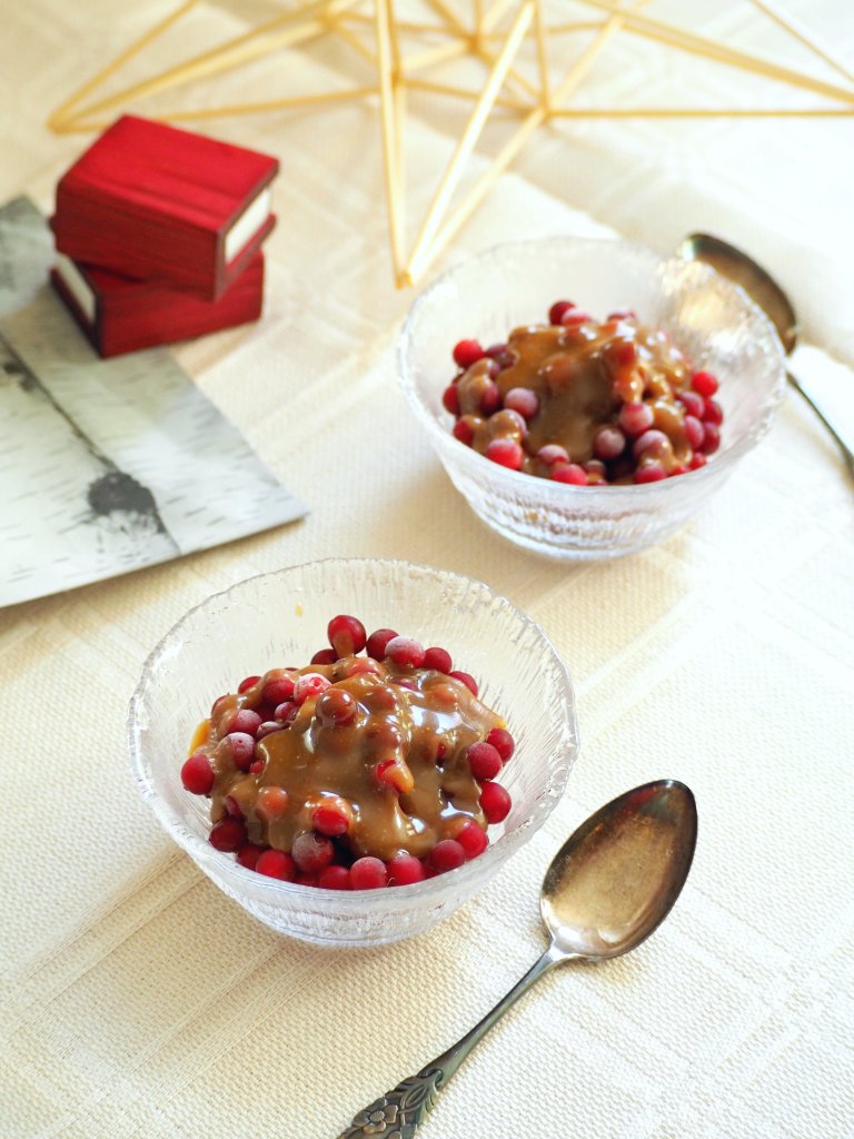 This time I introduce lingonberries with hot caramel sauce, a very simple dessert but ah so full of great taste! I used hand-picked lingonberries straight from the forest, but you can use frozen lingonberries too. Even cranberries work similarly if you don’t have access to lingonberries, so how about trying it out?