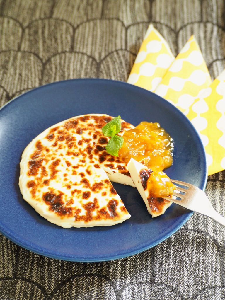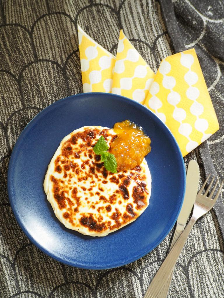 This time I’d like to introduce a perfect warm dessert for rainy days, Finnish baked leipäjuusto (literally bread-cheese) served with cloudberry jam. Leipäjuusto (or juustoleipä, depending on the region, but both are the same cheese) is a fresh cheese that has been slightly baked to give it firmer texture and typical spotted blackish-brown look. It tastes mild, and makes a characteristic sound when bitten.