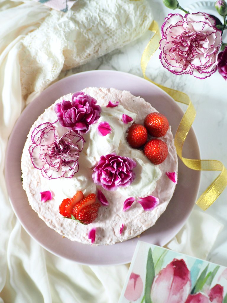 Good thing with mousse cakes is that they require no baking, so are easy to make even for a beginner. Using fresh strawberries that are in season now in Japan, the cake gets a sweet & tangy taste with beautiful light pink colour. Use some carnations for the topping and you are coring the bouquet part at the same time!