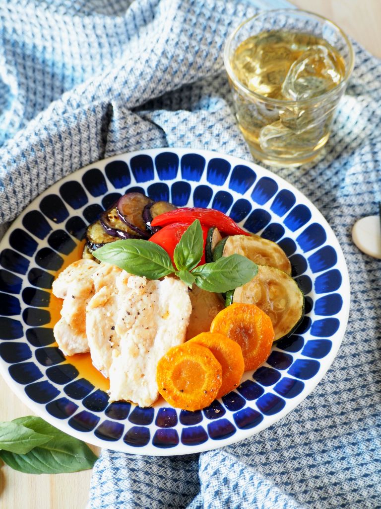 ジメジメした天気が続くとさっぱりとした食べ物が食べたくなり、今が旬の夏野菜をたっぷり使ったあっさりしたマリネを作ってみました。野菜ばかりだとたんぱく質が足りないので、鶏胸肉を焼いて一緒に提供することにし、糖質少なくてヘルシーな夏メニューが完了。