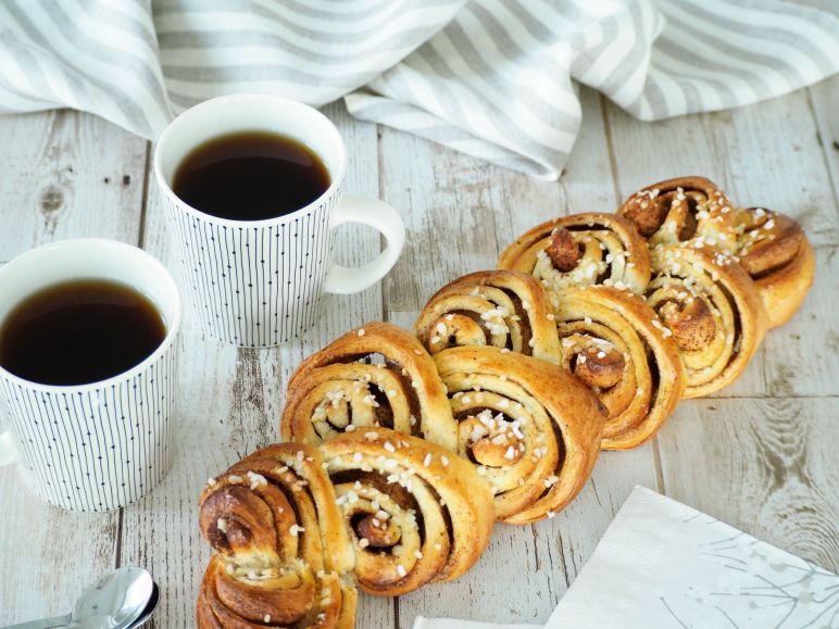 For the coming holiday season in mind, I shaped the rolls into a festive braid-like appearance – let’s call it a cinnamon roll braid (korvapuustipitko in Finnish). Compared to authentic braided pulla, this one is easier to make; you’ll just need scissors and a steady hand. If you are familiar with pain d’épi, a french bacon-rolled baguette, this one is cut in similar way.