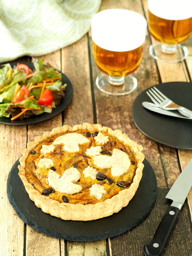 In case there is any of the pie dough left, you can roll it thin and take some autumn-themed cookies out of it and place on top of the quiche before baking – this will make the results super cute!