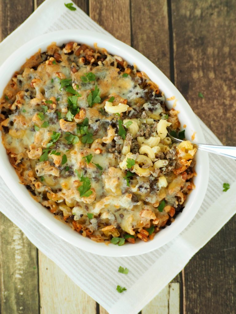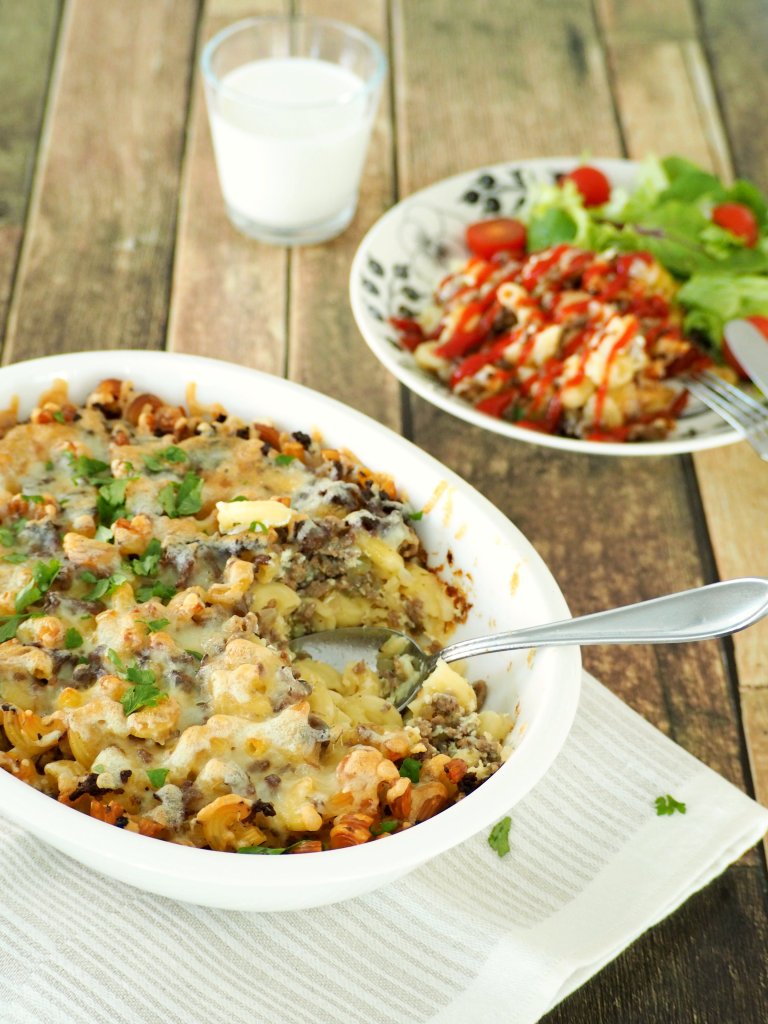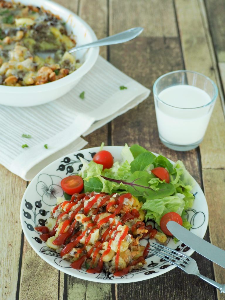 その主な材料は、マカロニ、ひき肉、玉ねぎ、牛乳と卵です。味付けには塩こしょうのほか、様々なハーブを入れれば味変ができるし、野菜やきのこを入れてボリュームを出すこともできます。ただ、結局一番シンプルなものは一番美味しいです(笑)また、食べる際にお好みにケチャップをかけて食べるのがポイントです。